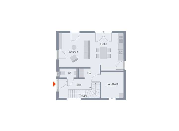 Bauherren mit geringem Raumbedarf oder begrenztem Grundstück finden mit Design 8 die ideale Lösung. Der kubische Satteldachklassiker bietet hohen Wohnkomfort und erfüllt alle Wünsche. Der offene Grundriss im Erdgeschoss sorgt für großzügigen Raum und viel Freiraum. Drinnen und draußen scheinen hier förmlich zu verschmelzen, denn gleich vier Türen ermöglichen einen direkten Zugang vom Wohnbereich nach außen. Auch in der oberen Etage flutet das Tageslicht dank bodentiefer Fenster den Raum. Die Raumnutzung und -aufteilung sind flexibel: Ob Schlafzimmer, Büro, Kinderzimmer oder Gästezimmer - alles ist möglich.