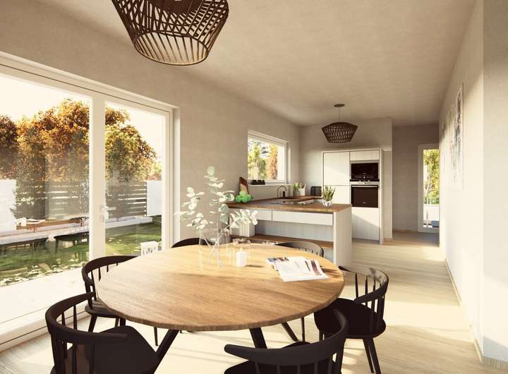 Zeitlose Eleganz von außen, großzügiger Raum und ein besonderes Raumgefühl von innen - das zeichnet unser Design 10 aus. Unter dem Satteldach erwarten etwa 135 m² auf zwei Ebenen darauf, bezogen und mit Leben gefüllt zu werden. Im Erdgeschoss steht Offenheit im Mittelpunkt: Der großzügige Wohn-Ess-Koch-Bereich erstreckt sich fast über die gesamte Ebene und wird lediglich durch die zentral platzierte Treppe von der Diele getrennt. Das Ergebnis ist ein heller, einladender und großzügiger Raum, ideal zum Wohlfühlen und Zusammenkommen. Im Eingangsbereich befinden sich zudem ein kleines Gäste-WC sowie ein großer Hauswirtschaftsraum. Über die mittig platzierte Treppe gelangt man ins Obergeschoss. Hier gibt es ausreichend Platz für Eltern und bis zu zwei Kinder. Die Eltern genießen ein großzügig gestaltetes Schlafzimmer mit separatem Ankleideraum, während zwei große Kinderzimmer ebenfalls keine Wünsche offenlassen. Das Raumangebot in der oberen Etage wird durch ein geräumiges Badezimmer mit Dusche, Badewanne und WC abgerundet.