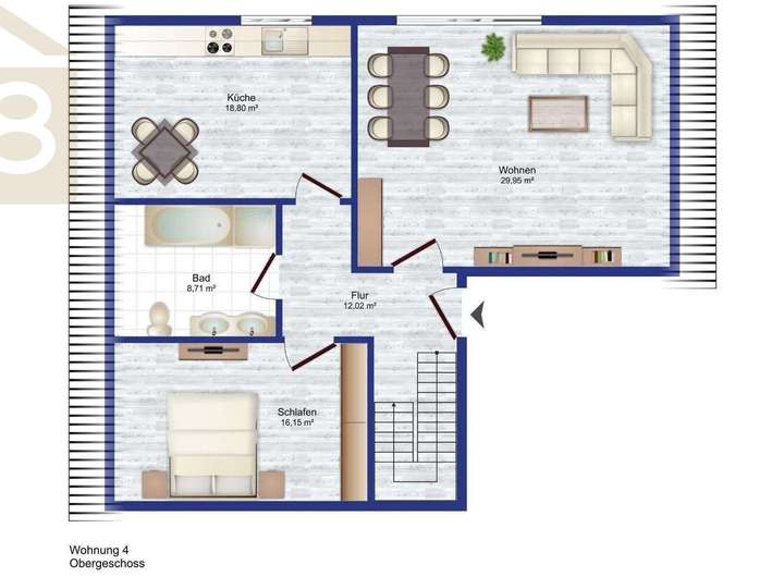 Im Ober- und Dachgeschoss liegen zwei 3-Zimmer-Maisonette-Wohnungen mit Wohnflächen von ca. 100 m² und ca. 110 m². Die Wohnungen verfügen jeweils über eine klassische Raumaufteilung mit Wohnbereich, Schlafzimmer, Kinderzimmer, Flur, Küche und Bad und sind aktuell zu monatlichen Nettokaltmieten von 750,00 € beziehungsweise 800,00 € vermietet.