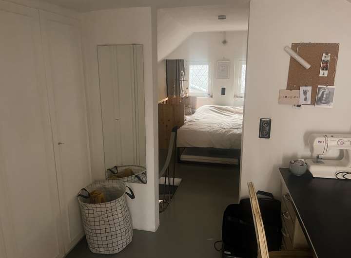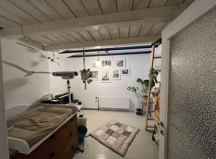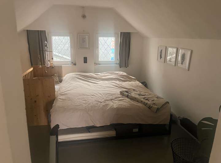 Wir wohnen hier als kleine Familie. Wen es nicht stört, dass das Schlafzimmer nach oben offen zum Wohnzimmer ist, kann hier auch als WG wohnen. Das „Kinderzimmer“ kann ganz normal abgeschlossen werden. (Ein Geländer für die Hochebene möchten wir eh noch besorgen.)