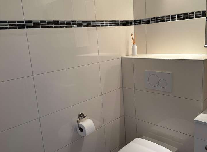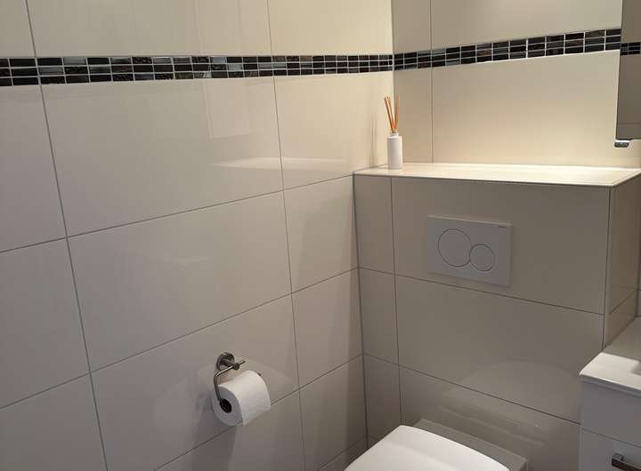 Das Tageslichtbad bietet sowohl Dusche als auch Badewanne. Das befindet sich als Gäste‑WC im Erdgesc.