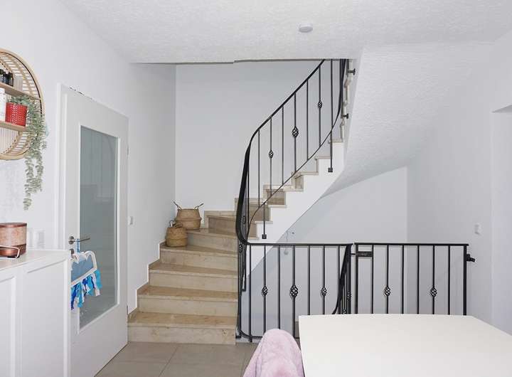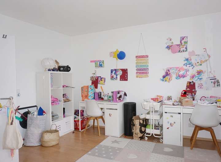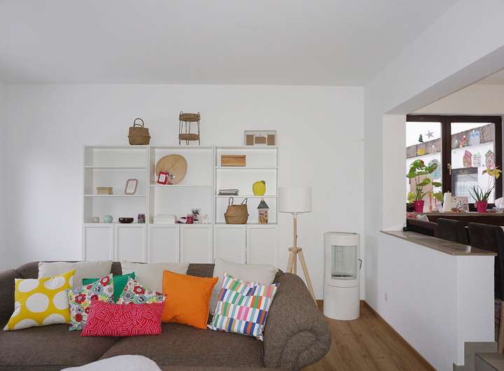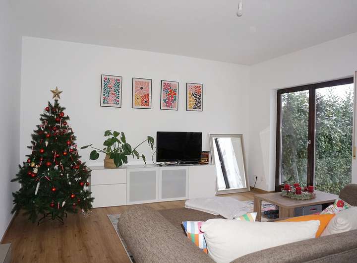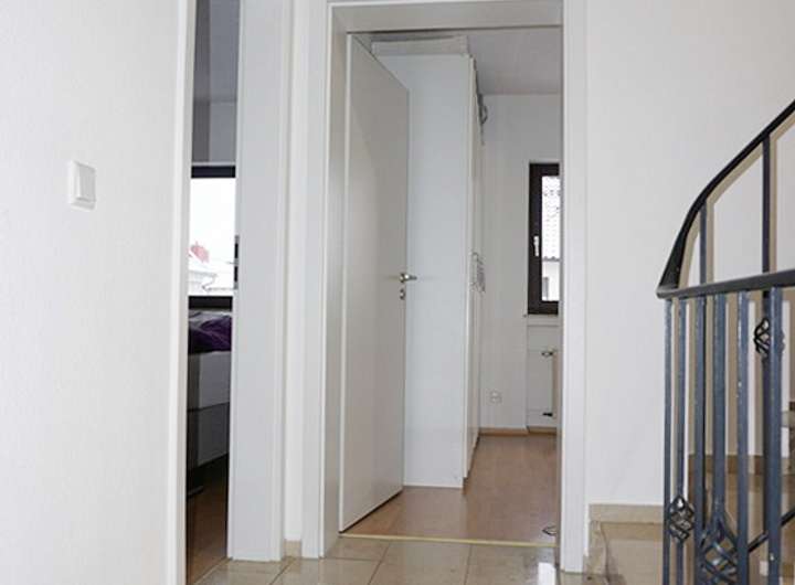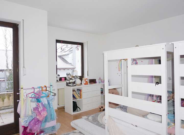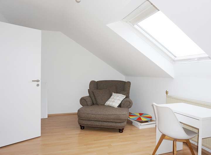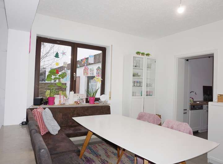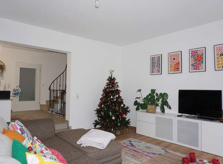 Wir starten im Erdgeschoss, welches primär durch den geräumigen Wohn-/Essbereich dominiert wird. Hier genießen Sie das Beisammensein in der Familie und gelangen von hier aus auch in den kleinen Garten. Die Grünfläche hat genau die richtige Größe: groß genug zum Toben und Spielen, aber nicht zu groß um für die Gartenarbeit zu lange zu brauchen. Die abgebildete Küche ist noch recht neuwertig und Eigentum der Mieterin und kann übernommen werden (3.000€ VHB inkl. Elektrogeräte). Abschließend befindet sich ein Gäste-WC sowie ein Abstellraum im Eingangsbereich. Das Obergeschoss bietet drei Schlafräume und ein Tageslichtbad mit Badewanne und Dusche. Zwei weitere Zimmer liegen im Dachgeschoss.