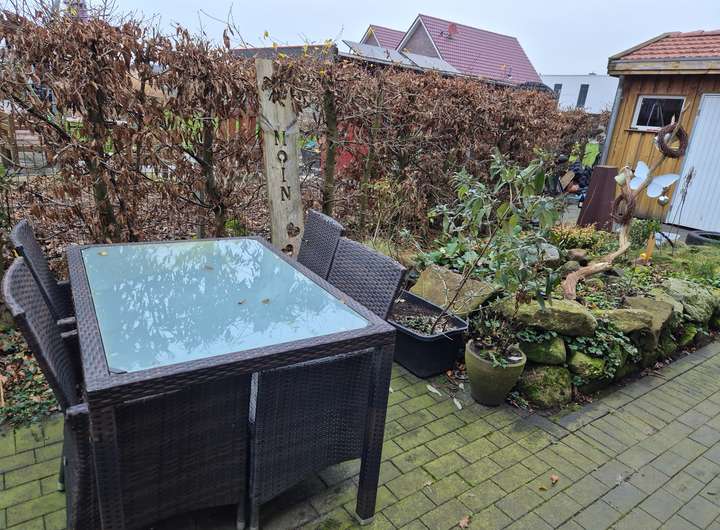 Das Grundstück ist mit einer lebenden Hecke umzäunt. Im liebevoll angelegten Garten befinden sich Zierbeete sowie ein kleiner Springbrunnen.