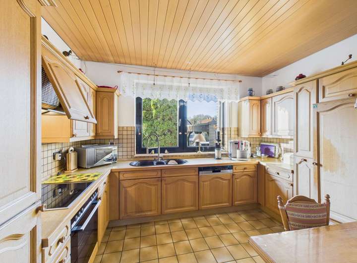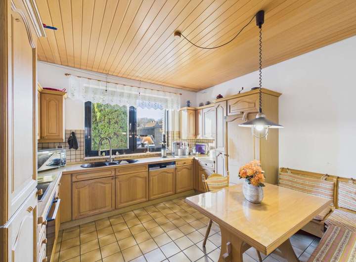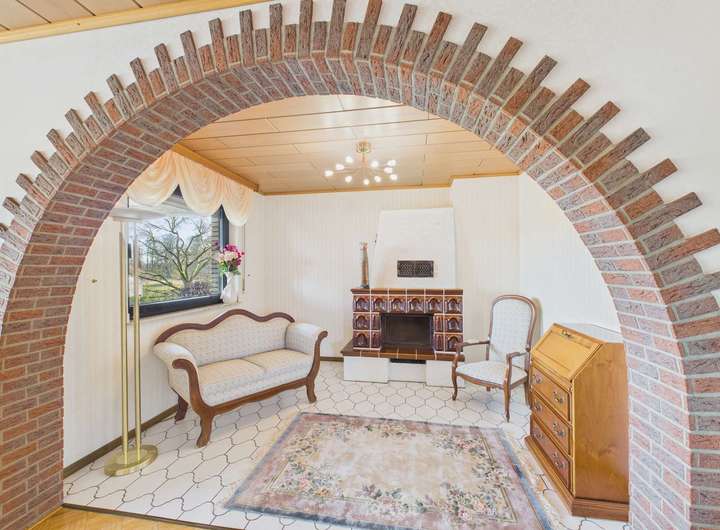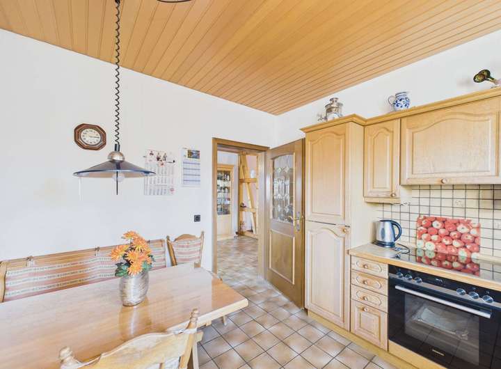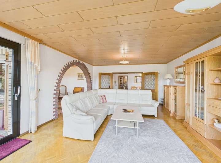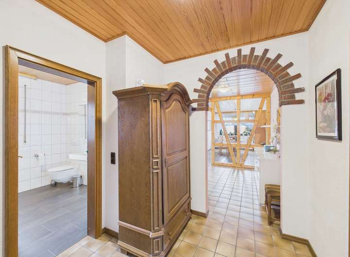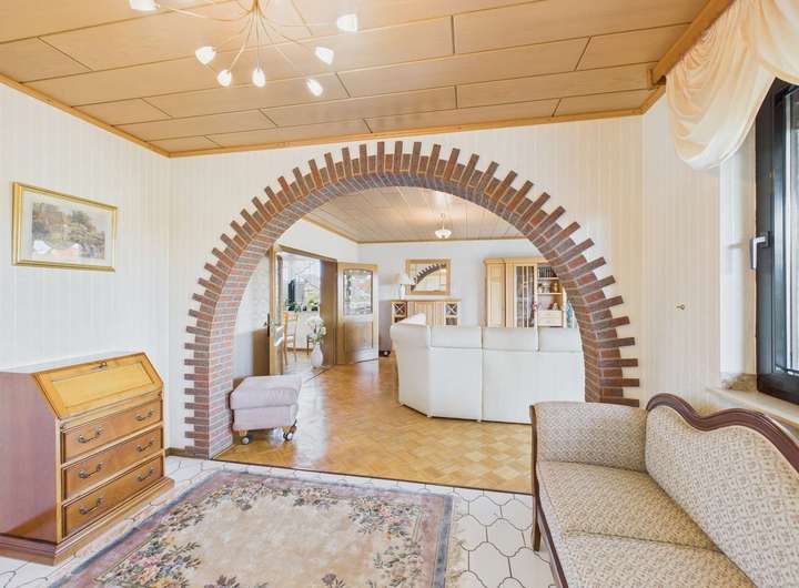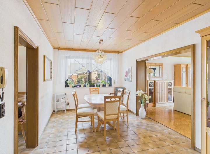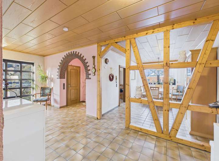 Auf der linken Seite geht es zum Gäste-WC und zur Garderobe. Folgen Sie der Diele bis zum Ende, dann sehen Sie auf der linken Seite einen Raumteiler aus Holz, der einem Fachwerk nachempfunden wurde. Er trennt die Diele vom Esszimmer. Vom Esszimmer führt links eine Tür in die Küche. Rechts geht es weiter in das große Wohnzimmer mit gemütlicher Kaminecke und direktem Zugang zur Terrasse.