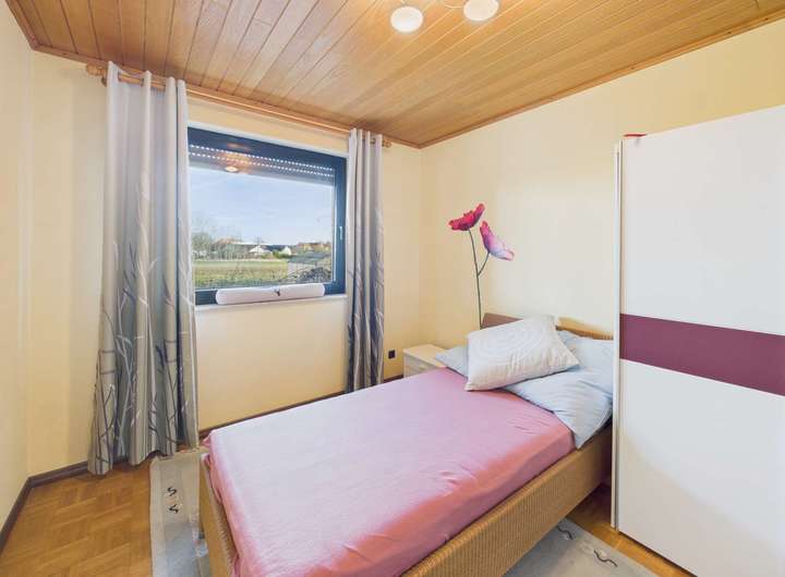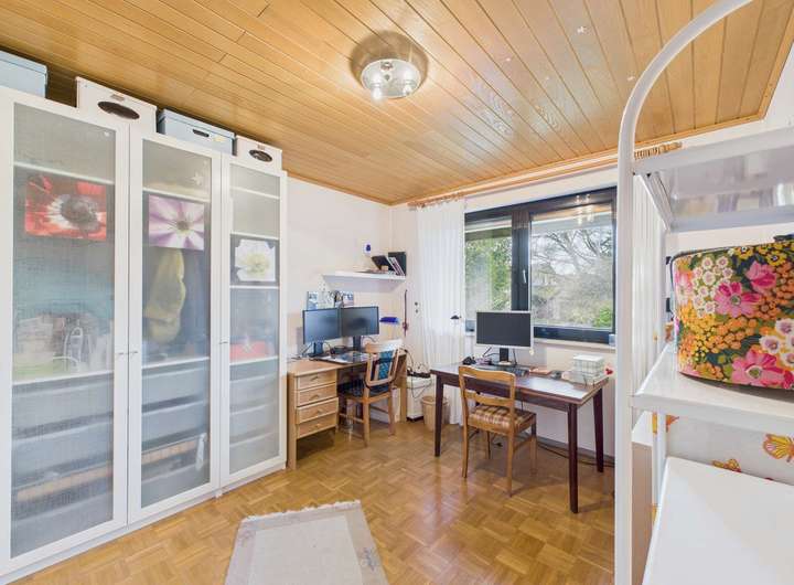 Gegenüber dem Esszimmer mündet die Diele in einem Flur. Er verbindet das modernisierte Duschbad mit drei Schlaf- oder Arbeitszimmern. Von einem dieser Zimmer gelangen Sie ebenfalls auf die Gartenterrasse.