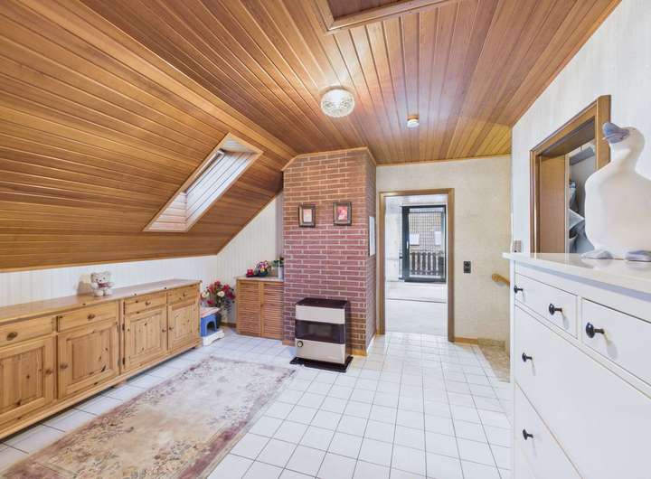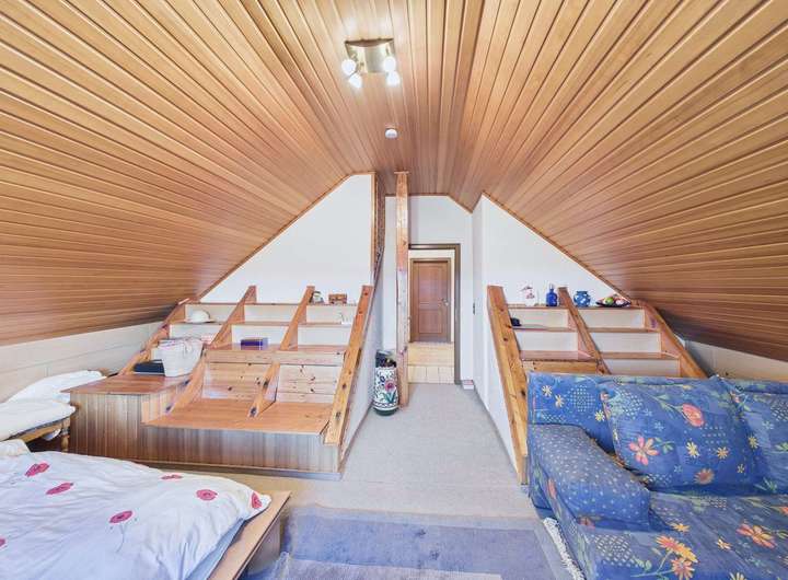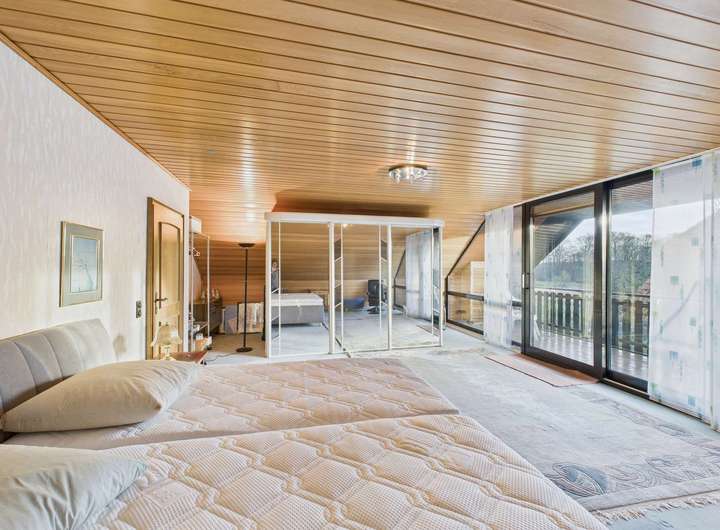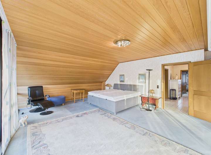 Im Obergeschoss verbindet eine ebenfalls großzügig gestaltete Diele vier Zimmer und ein Bad. Highlight ist das 40 qm große Schlafzimmer mit direktem Zugang zum überdachten Balkon. Trotz seiner Größe wirkt der Raum sehr gemütlich.
