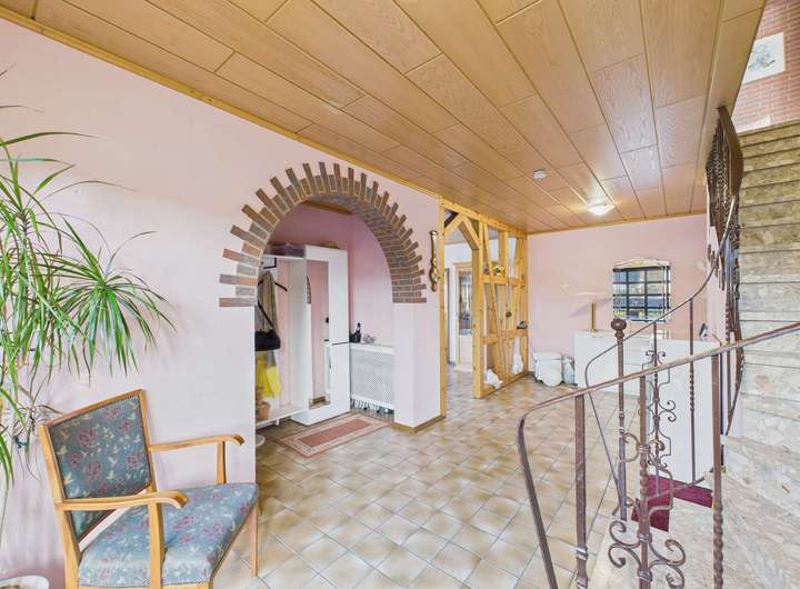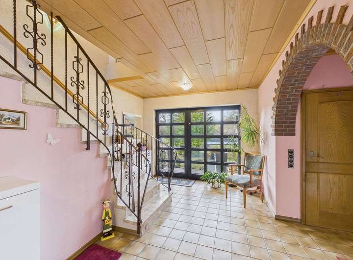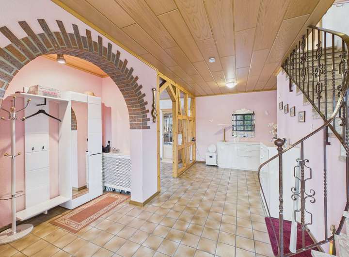 Die große Diele verbindet alle Bereiche im Erdgeschoss. Gleich rechts führt die geschwungene Treppe ins große Dachgeschoss. Im hinteren Bereich gelangt man auch in das bewohnbare Untergeschoss.