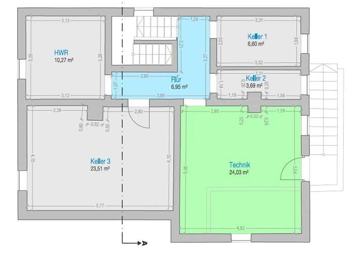 Vollunterkellerung: Großräumige Räume und direkter Gartenzugang via Außentreppe.