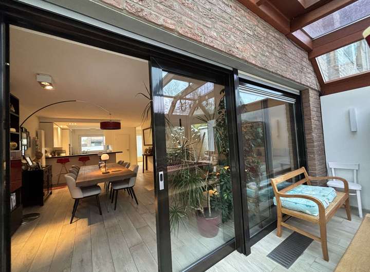 Im Erdgeschoss empfängt Sie ein herrlich offenes und zugleich gemütliches Wohnkonzept. Hier befinden sich der praktische und einladende Eingangsbereich, die große, vollausgestattete Küche, der angrenzende große Wohn-, und Essbereich, sowie das Gäste WC. Über bodentiefe Fenster gelangen Sie vom Wohnbereich aus zum Wintergarten, zur Terrasse und in den harmonisch angelegten Garten. Die wunderbare Gestaltung des Innenbereichs führt sich über den lichtdurchfluteten Wintergarten, nahtlos in den Außenbereichen fort.