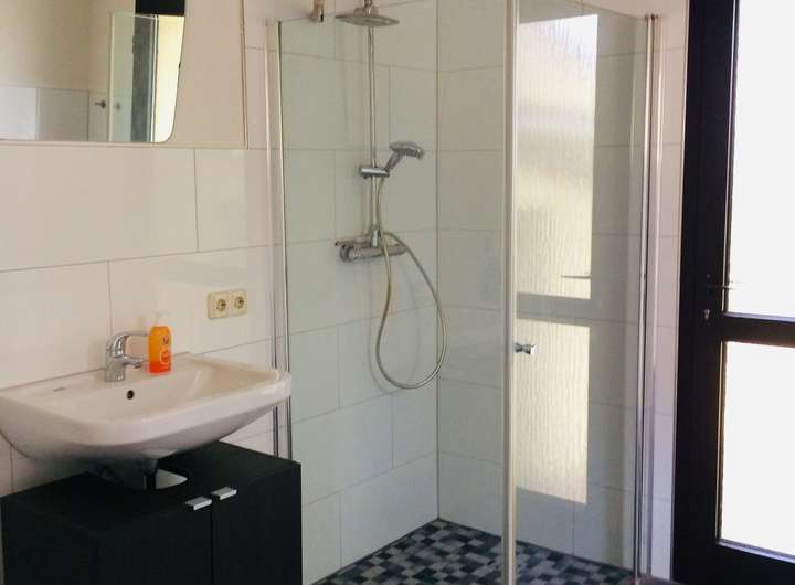 Vom Garten kommend geht es über eine kleine überdachte Terrasse direkt zum Duschraum.