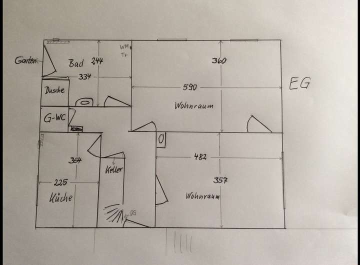 Das Haus hat 5 Zimmer. Im EG sind Esszimmer, Wohnzimmer, Dusche, Gäste-WC und Küche.