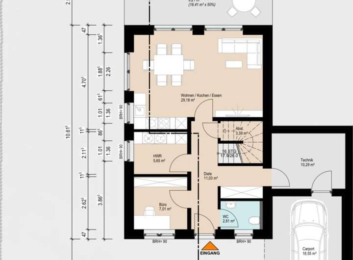 Das genehmigte Einfamilienhaus ist als kompakter und familienfreundlicher Neubau geplant. Im Erdgeschoss befinden sich neben dem Eingangsbereich ein separates Büro, ein Gäste-WC sowie praktische Nebenräume für Haushalt und Technik, wobei der Technikraum direkt an das Carport angebunden ist. Der offene Wohn- und Essbereich mit Küche orientiert sich zum Garten und bietet direkten Zugang zur Terrasse.