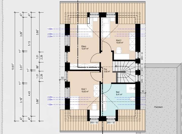 Im Obergeschoss stehen zwei Kinderzimmer, ein Elternschlafzimmer sowie ein Badezimmer mit Dusche und Badewanne zur Verfügung.