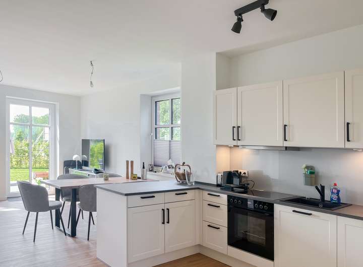 -großer Wohn-Essbereich mit Einbauküche und Zugang auf die Terrasse