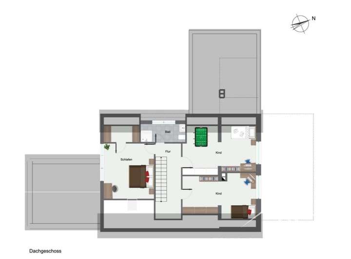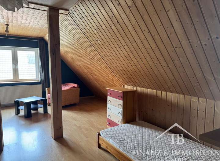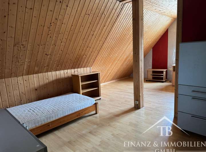 In der oberen Etage befinden sich ein Badezimmer (Dusche/ WC), sowie links ein großes Schlafzimmer. Auf der rechten Seite befinden sich zwei weitere Zimmer; wahlweise Kinderzimmer, Büro oder Ankleide. Eine weitere Treppe führt nun zum Dachboden, der viel Stauraum bietet und zum Teil ausgebaut ist. Ein weiteres Kinderzimmer, Büro oder Gästebereich ist vorhanden.