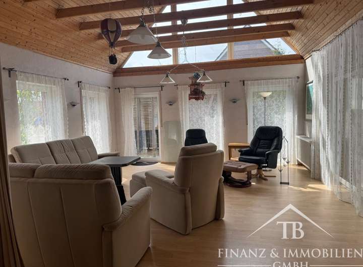 Viel Platz für individuelle Gestaltungsmöglichkeiten bietet das großzügig und offen gestaltete Wohnzimmer, welches zum Entspannen und Wohlfühlen einlädt. Ein besonderer Hingucker ist der Giebel mit großer Fensterfront, so dass eine tolle natürliche Belichtung stattfindet.