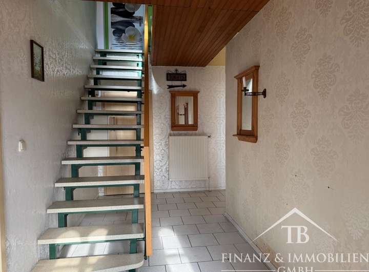 Des Weiteren befinden sich ein Badezimmer mit Badewanne, eine Gästetoilette, eine Abstellkammer und der Zugang zum Hauswirtschaftsraum und Werkstatt in der unteren Etage.