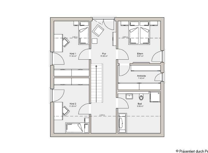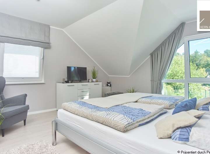 Die Treppe führt in die oberen Flur, der besonders geräumig gestaltet ist und in der Gaube Platz für eine gemütliche Leseecke bietet. Zwei gleichgroße Kinderzimmer, ein Familienbad und ein Elternschlafzimmer mit Ankleide komplettieren das Dachgeschoss. Hier kann man sich wohlfühlen!