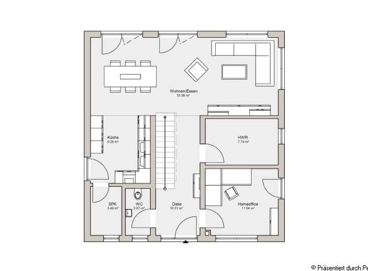 Schon bei dem Eintreten begeistert das Haus mit einem offenen Flur mit Blick in den Wohnbereich, der direkt anschließt. Vorbei an der geraden Treppe beindruckt der Wohnbereich mit vielen bodentiefen Fenstern, die Licht und Helligkeit in den Raum bringen. Gerade das Sofa lädt zu gemütlichen Couchnachmittagen ein. Vom Esstisch öffnet sich der Blick in die geräumige Küche. So ist man auch beim Kochen mitten im Geschehen im Wohnbereich. Ergänzt wird die Küche durch eine Speisekammer, wo Vorräte ihren Platz finden. Außerdem gehört ein Home-Office, ein Gäste-WC und ein Hauswirtschaftsraum zum Erdgeschoss von Haus Fida.