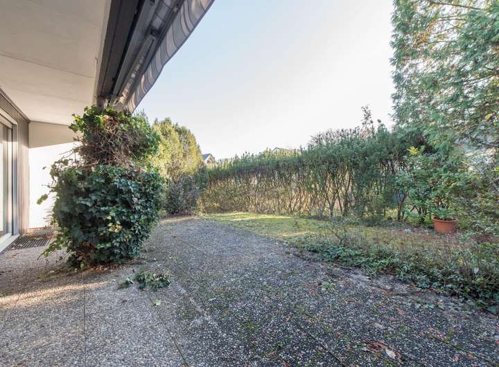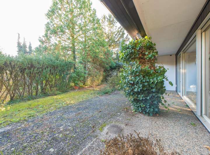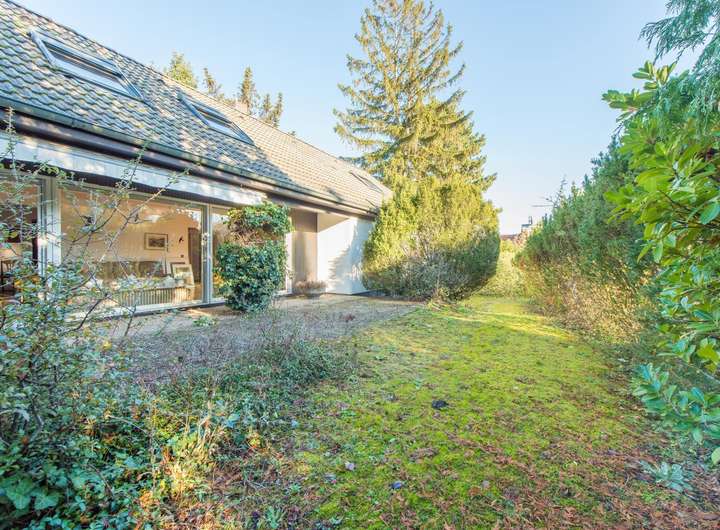 Das Haus wurde dem überwiegend ebenen Höhenverlauf des Grundstücks perfekt angepasst. Der Eingangsbereich liegt ca. 4 Treppenstufen höher und ist somit im Hochparterre. Der diametral gelegene Terrassenbereich direkt vorm Wohn-Esszimmer ist hingegen eben, ohne Treppen zu erreichen. Diese wunderbare Höhenanpassung im Geländeverlauf erlaubt einen fast barrierefreien Zugang auf der Terrassenseite und gleichzeitig einen helleren Keller auf der Eingangsseite.