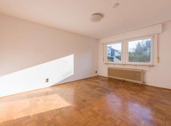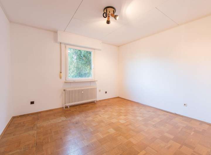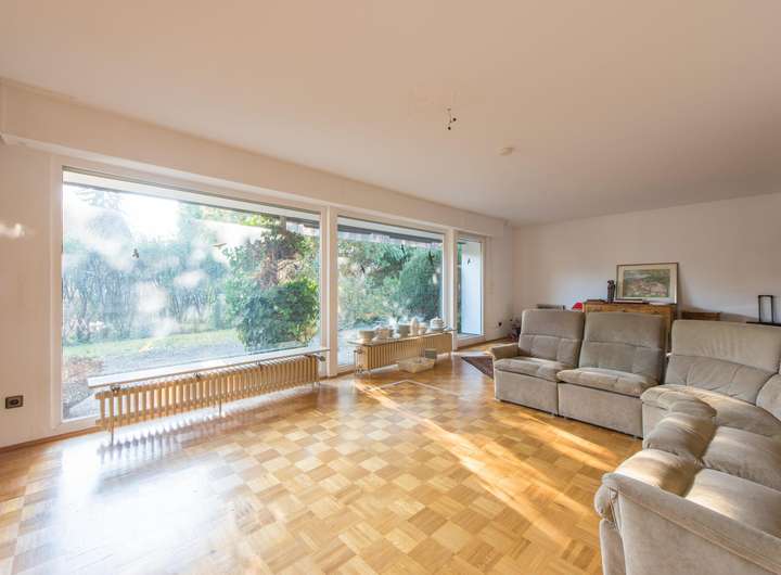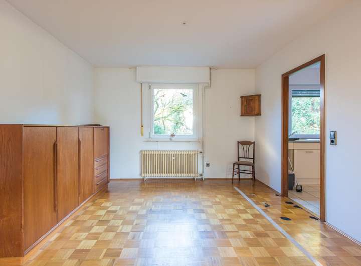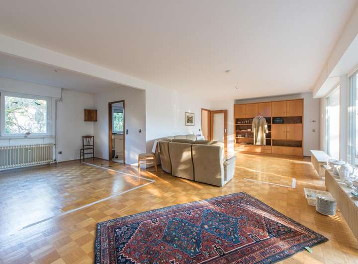 Die schöne, ca. 30 m² große Südterrasse wird über das Wohnzimmer durch eine bodentiefe Fenstertür fast schwellenlos erschlossen. Der große Wohn-Essraum ist mit Vollholzparkett Eiche in der Verlegeart Mosaik ausgelegt. Der Boden versprüht einen schönen warmen Vintage Charme, der zum Baujahr des Hauses passt. Das Esszimmer liegt im rechten Winkel zum Wohnraum und damit unmittelbar vor der mittelgroßen, separateren Küche mit 2 Eingängen zum Esszimmer und zum Zentralflur.