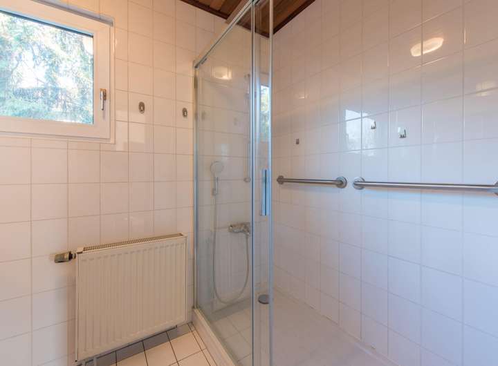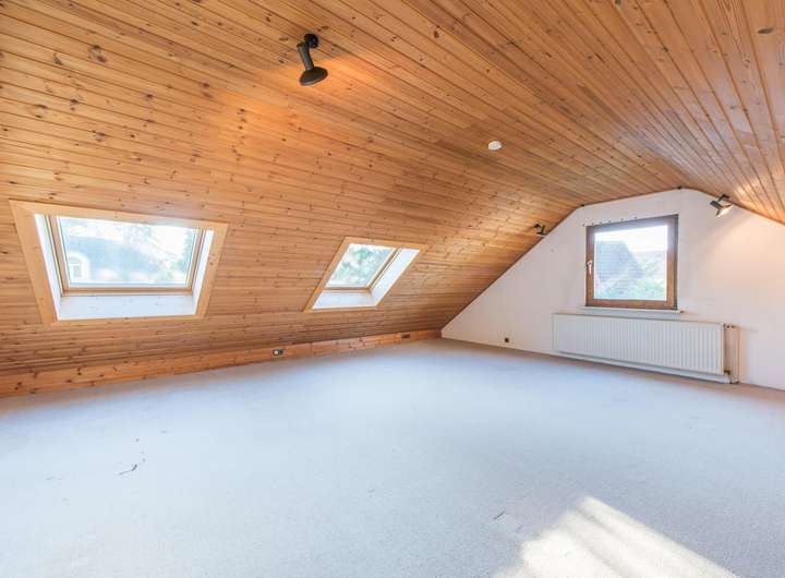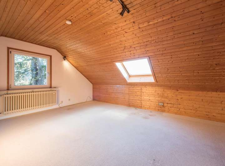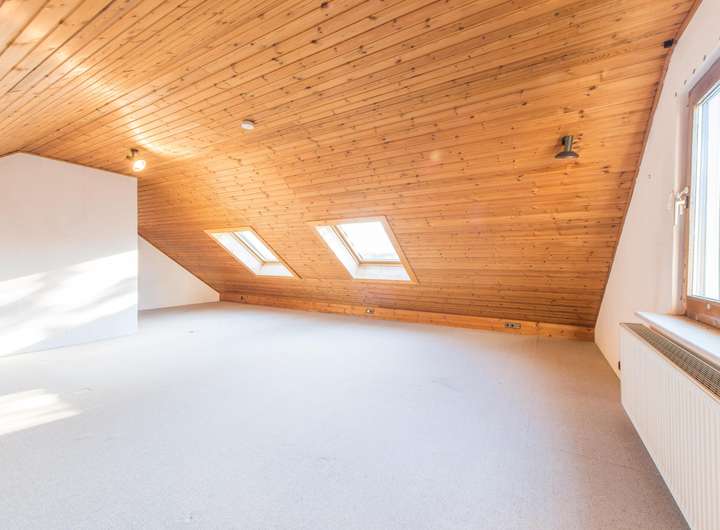 Den Flur ein Stück weiter hinunter finden Sie ein modernisiertes Tageslichtbad mit großer bodengleicher Dusche. Die drei folgenden Zimmer sind unterschiedlich groß und bieten alle den gleichen schönen Vintage Parkett aus Eiche. Falls Sie zwei Kinder haben, könnten z.B. die Eltern 2x Homeofficeräume und das Hauptschlafzimmer im Erdgeschoß beziehen, während die Kinder Ihr eigenes Reich im riesigen Dachgeschoß finden.