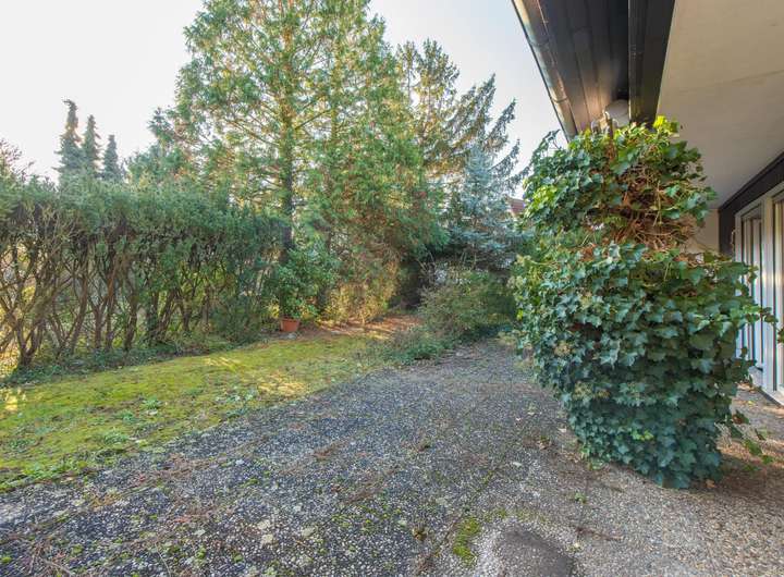 Ihr Weg zum Haupteingang führt Sie durch einen schönen Teil Ihres großen Gartens hin zum Eingang. Da das Haus relativ mittig im Grundstück errichtet wurde, verteilt sich der Garten wunderbar über drei Zonen, die z.B. in Kinderspielbereich (vorm Haus), Terrassengarten vorm Wohn-Esszimmer (Mitte Haus und im Süden) und Nutzgarten (hinter dem Haus) aufgeteilt werden könnten.