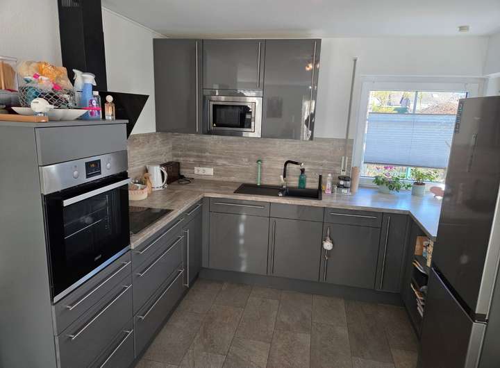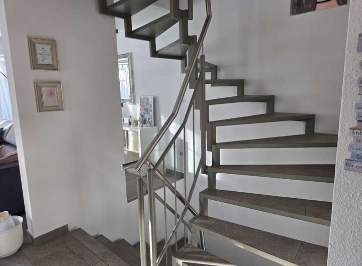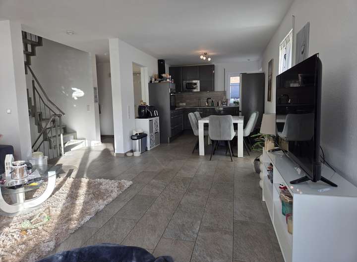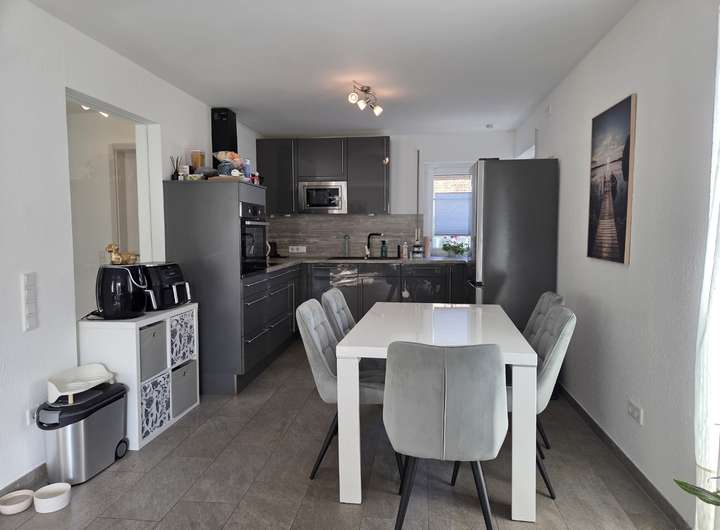 Das Erdgeschoss ist offen und zeitgemäß gestaltet. Der großzügige Wohn-, Ess- und Küchenbereich schafft eine angenehme Wohnatmosphäre und bietet viel Raum für gemeinsames Leben. Die vorhandene Einbauküche kann optional übernommen werden.