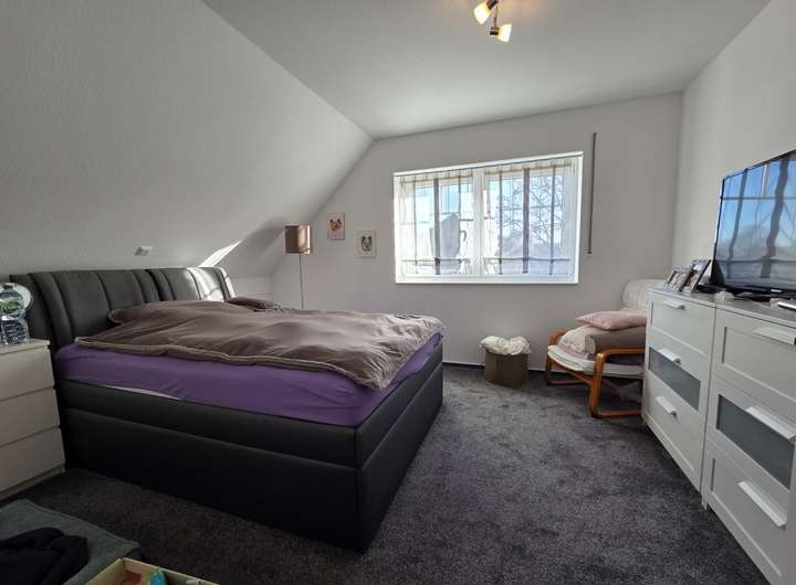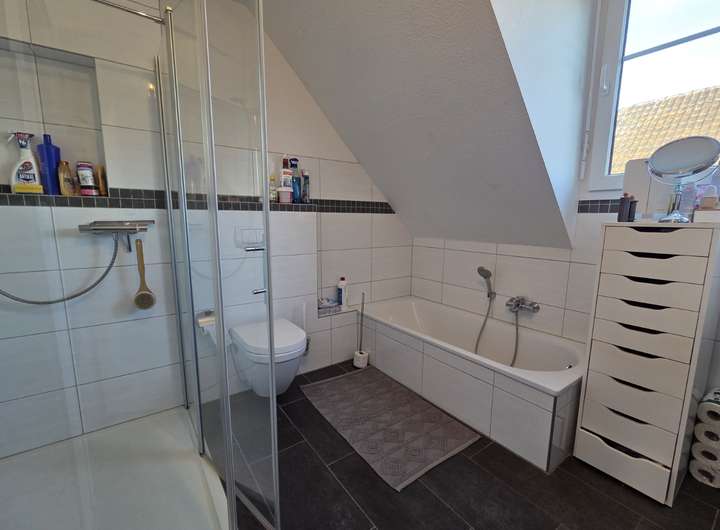 Im Dachgeschoss befinden sich das Badezimmer mit Badewanne und Dusche sowie drei weitere Schlafzimmer. Zusätzlich steht im ausgebauten Spitzboden ein weiterer Wohnraum zur Verfügung.