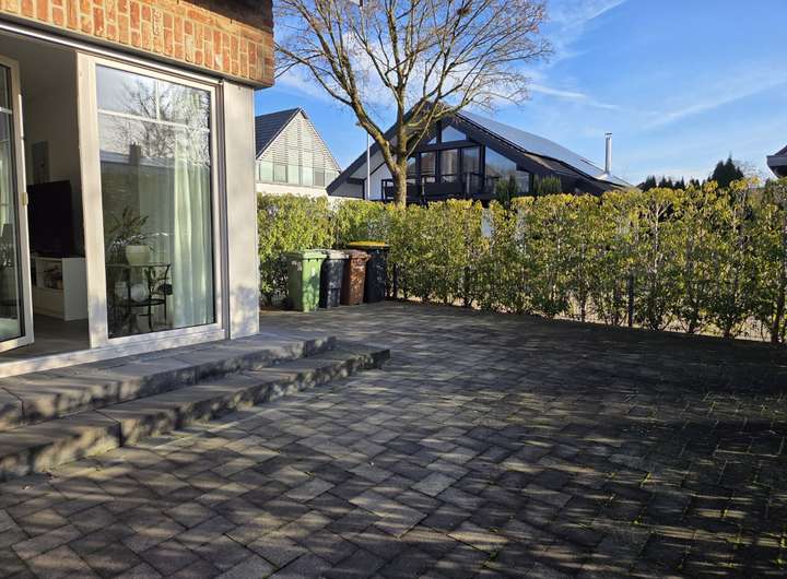 Der Gartenbereich ist kompakt gehalten. Besonders hervorzuheben ist der großzügige Terrassenbereich, der direkt an den straßenseitig gelegenen Pkw-Stellplatz angrenzt.