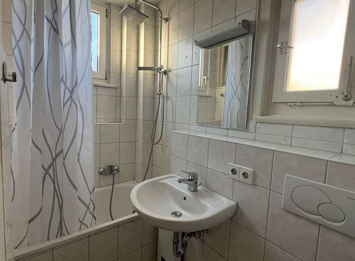 Angrenzend hierzu befindet sich eines der beiden Tageslichtbadezimmer mit einer Badewanne, Waschtisch und WC - optimal geeignet als Gäste-Bad oder Gäste-WC.