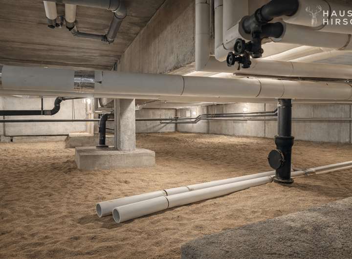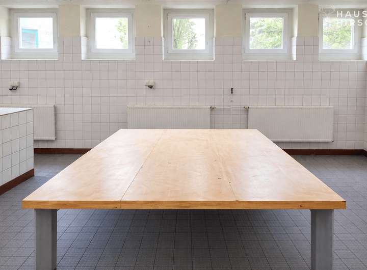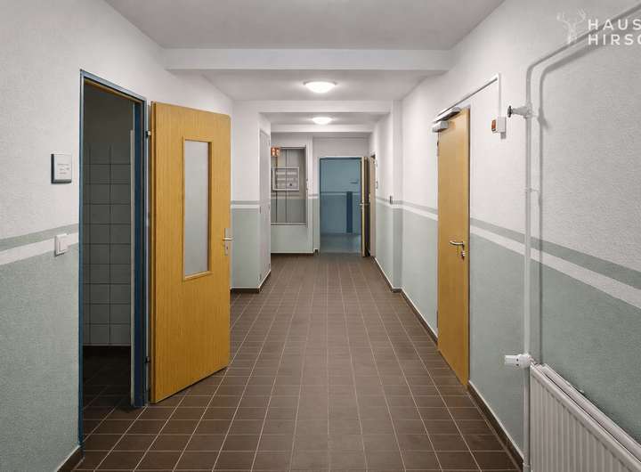 Das Gebäude ist vollunterkellert und bietet umfangreiche Lager-, Technik- und Nebenflächen sowie einen separaten Wirtschaftszugang. Teilbereiche wurden ursprünglich als Luftschutzanlage errichtet. Lokal sind Feuchteschäden erkennbar; nutzungsabhängig sind entsprechende Instandsetzungs- und Modernisierungsmaßnahmen einzuplanen.