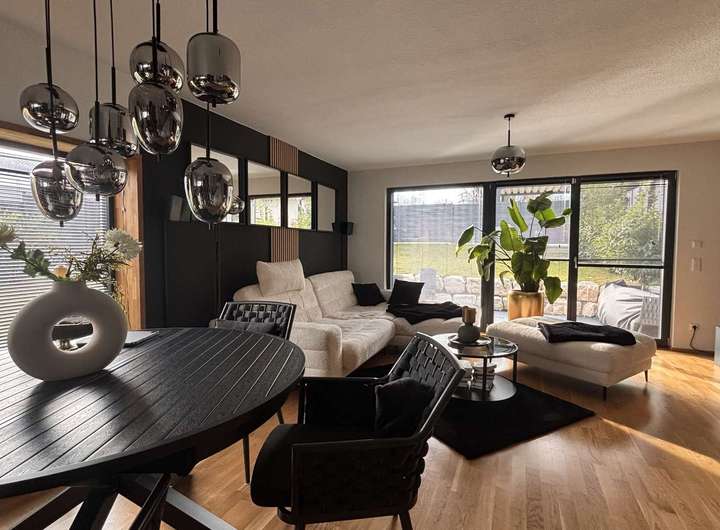 Eine Fußbodenheizung in allen Räumen sorgt für gleichmäßige Wärme. Der Wohn- und Essbereich ist offen gestaltet und bietet direkten Zugang zur Terrasse mit Gartenanteil.