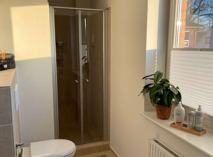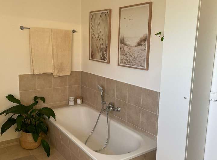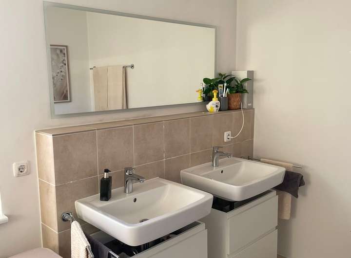 Vollbad mit Dusche, Badewanne, 2 Waschtischen und großem Fenster (11,3 qm)