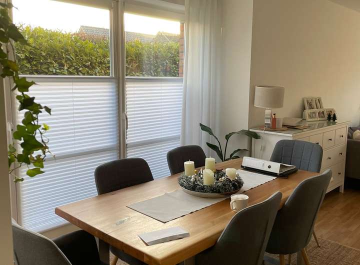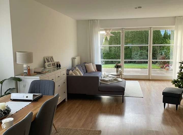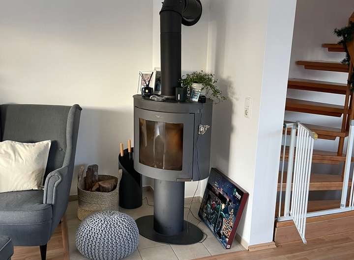 Wohn-Esszimmer mit Kaminofen und Zugang in den Garten mit Süd-Terrasse (36,4 qm)