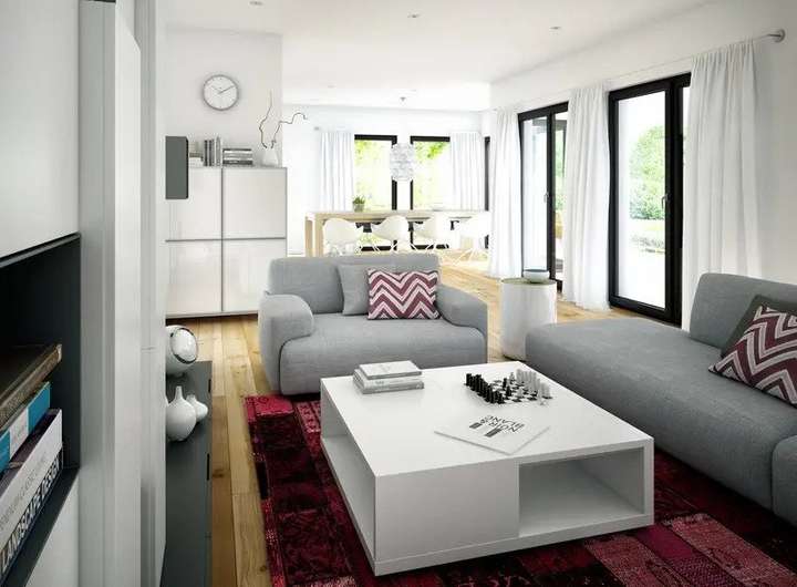 Das Leben auf dem Land hat viele Vorteile: Es herrscht Ruhe, die Luft ist frischer und sauberer als in der Stadt und man hat die Natur gleich vor der Tür. Zudem sind die Grundstücke in ländlichen Regionen oft deutlich größer als in stadtnahen Gebieten. Hier kann man sich noch den Traum vom großzügigen, frei stehenden Eigenheim erfüllen - beispielsweise mit diesem modernen Landhaus. Die Basis bildet ein quadratischer Baukörper, an den sich ein großzügig verglaster Wintergarten-Erker mit Balkon on top anschließt. Die Hausecken werden von formschönen Übereck-Verglasungen - im Erdgeschoss bodentief ausgeführt - in Szene gesetzt. Sie geben den Blick auf die Umgebung frei und bringen die Sonne in die Innenräume. Gekrönt wird das Fertighaus von einem flach geneigten Satteldach mit weiten Dachüberständen, das den typischen Landhaus-Charme versprüht. Die Raumaufteilung im Innern zeigt sich überraschend offen: Betreten wird das Gebäude über eine repräsentative Diele mit Garderobenbereich. Schon vom Eingang aus fällt der Blick durch die Gemeinschaftsräume bis hinaus in den Garten. Links gelangt man auf kurzem Weg direkt in die Küche, die eine lockere Verbindung mit dem Wohn- und Essbereich eingeht. Sie erstreckt sich bis in den Wintergarten hinein und bietet sich für eine unkonventionelle Einrichtung an. Statt für die typische Küchenzeile können sich die Bauherren für eine trendige Kücheninsel entscheiden, die Spüle, Herd, Stauraum und eine Theke kombiniert. Vorräte und sperrige Getränkekästen finden in der geräumigen Speisekammer Platz, die sich direkt anschließt. Zusätzliche Abstellfläche bietet der Technik- und Hauswirtschaftsraum rechts neben der Diele. Ergänzt wird das Raumangebot im Erdgeschoss von einem Gäste-WC. Das Dachgeschoss beherbergt zwei großzügig dimensionierte Kinderzimmer, einen Schlafraum mit integriertem Ankleidebereich sowie ein lichtdurchflutetes Wellnessbad mit Dusche und Wanne. Aber nicht nur die Schlafzimmer laden zum Relaxen ein, sondern auch die luftige Galerie, die von einem Dachflächenfenster zusätzlich mit Tageslicht versorgt wird.