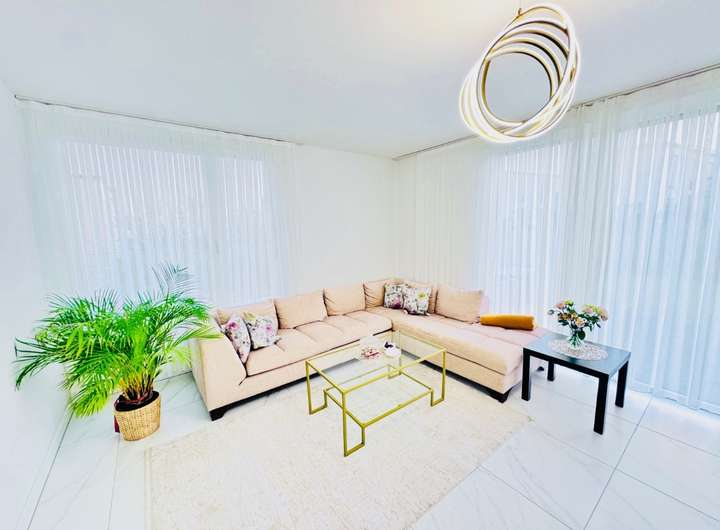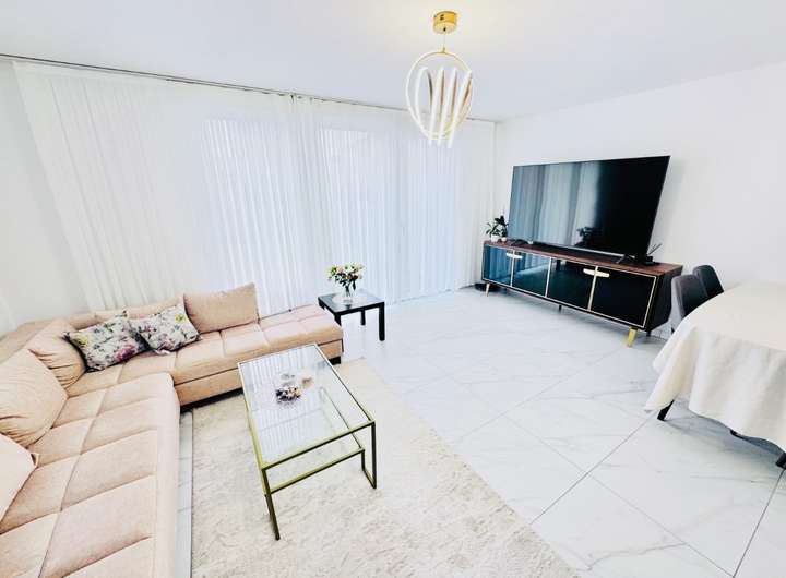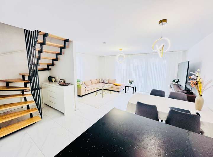 Dieses neuwertige, moderne eigerichtete Reihenhaus begeistert durch eine helle, großzügige Raumgestaltung auf drei Etagen, hochwertige Materialien sowie eine klare, elegante Innenarchitektur. Über insgesamt ca. 120 m² Wohnfläche verteilt sich ein perfekt strukturierter Grundriss, der Komfort, Funktionalität und modernes Wohngefühl ideal vereint. Bereits beim Betreten empfängt Sie eine freundliche Diele, von der aus der lichtdurchflutete Wohn- und Essbereich zugänglich ist. Die bodentiefen Fenster sorgen für ein offenes, weites Wohnambiente und bieten direkten Zugang zur Terrasse und dem pflegeleichten Garten. Der geräumige Wohnbereich ist stilvoll möbliert und bietet genügend Platz für großzügige Sitz- und Esslandschaften.