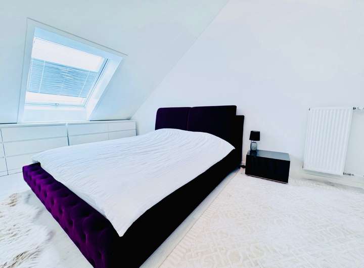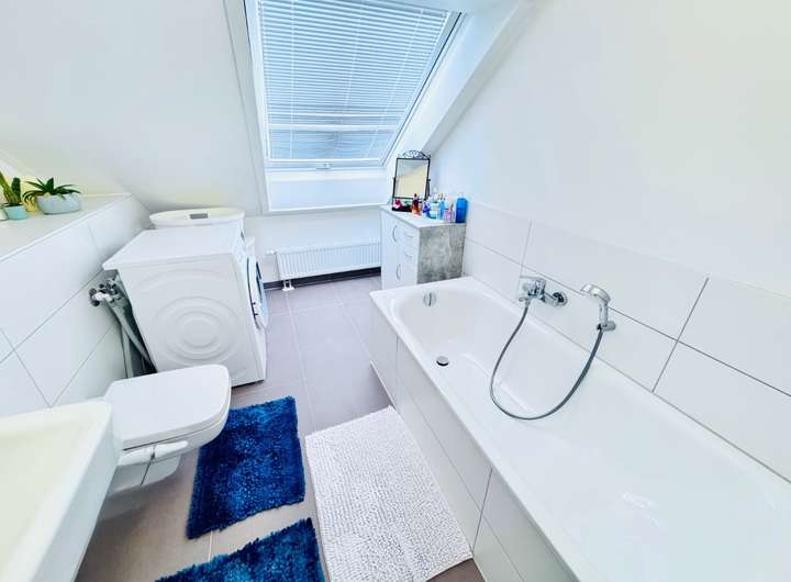 Im Dachgeschoss erwartet Sie ein stilvolles Schlafzimmer mit hoher Deckenwirkung, das durch seinen harmonischen Schnitt und viel Tageslicht einen besonders ruhigen Rückzugsort bildet. Direkt angrenzend befindet sich ein hochwertig ausgestattetes Badezimmer mit Badewanne, Waschmaschinenanschluss, großem Spiegel, modernem Waschtisch und einem großzügigen Fenster. Auch hier sorgen klare Linien und helle Farbtöne für ein zeitloses Wohlfühlambiente. Ein weiteres Highlight des Dachgeschosses ist der separate Ankleideraum, der mit maßgeschneiderten Regalsystemen optimal genutzt ist und viel zusätzlichen Stauraum bietet. Ein weiterer kleiner Raum eignet sich flexibel als Abstell-, Hobby- oder Bürozimmer.