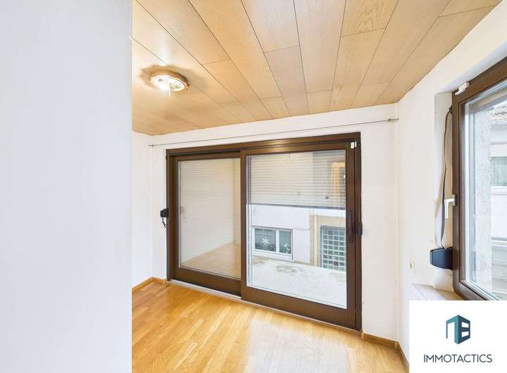 Das Erdgeschoss umfasst ein kompakt geschnittenes Wohnzimmer mit direktem Zugang zur überdachten Terrasse, die in den Innenhof übergeht. Die separate Küche mit vorhandener Einbauzeile schließt unmittelbar an und ist über ein Fenster angenehm belichtet. Diese Ebene wird durch ein Tageslichtbad mit Dusche und Waschbecken sowie einen kleinen Flur mit Treppenaufgang in das Obergeschoss abgerundet.