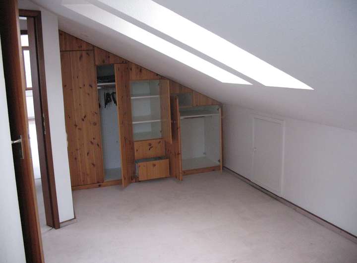 Im Obergeschoss liegen 1 ½ Zimmer, Bad, Flur und Abstellbereich. Hier sind einige praktische Einbauschränke vorhanden.