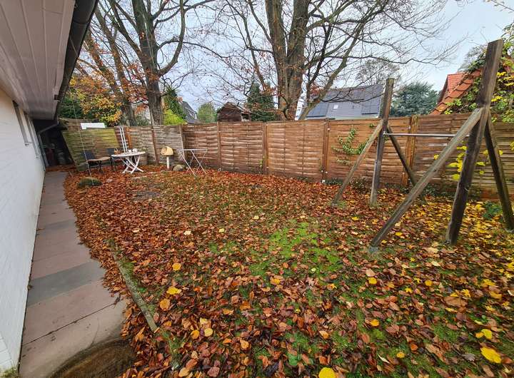 Im Garten sind überwiegend Rasenflächen, geringer Baumbestand und Zuwegungen vorhanden.