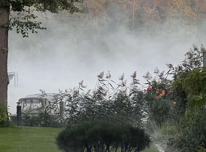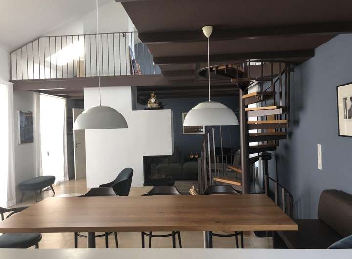 loftartige Salon vereint auf 60 qm Kochen, Speisen, Wohnen und Bibliothek, Medienbereich auf der Empore. Im Wohnbereich sorgt ein nach drei Seiten verglaster Kamin für kuschelige Wärme. Der Salon bildet das kommunikative Zentrum des Hauses, lässt nach Osten, Süden und Westen das Sonnenlicht auch im Winter herein und öffnet sich zum Wasser hin mit einer vorgelagerten Terrasse von 40 qm.