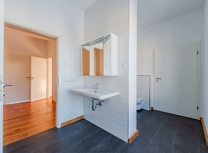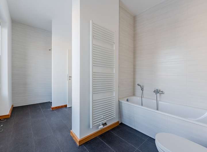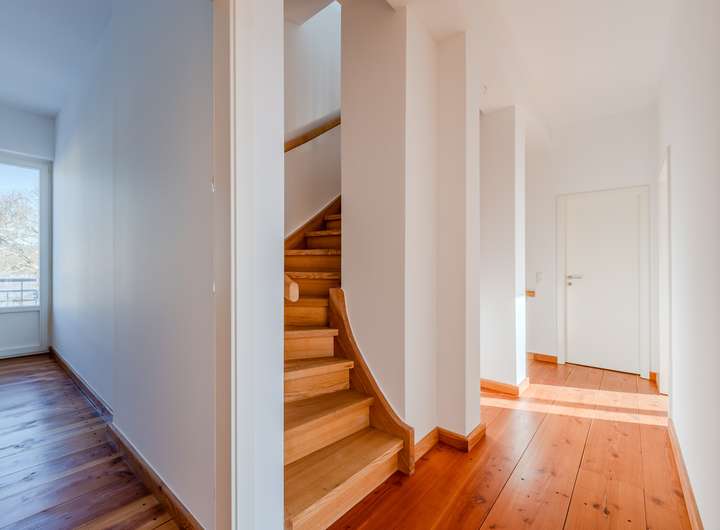 Im ersten Obergeschoss erwartet Sie der private Schlafbereich. Zwei vielseitig nutzbare Arbeits- oder Kinderzimmer, ein großzügiges Badezimmer mit Badewanne und bodengleicher Dusche, ein Masterbedroom mit komfortablem Ankleidebereich sowie ein praktischer Hauswirtschaftsraum bieten höchsten Wohnkomfort. Auch auf dieser Etage sorgen bodentiefe Holzfenster in allen Räumen für ein lichtdurchflutetes Wohngefühl.
