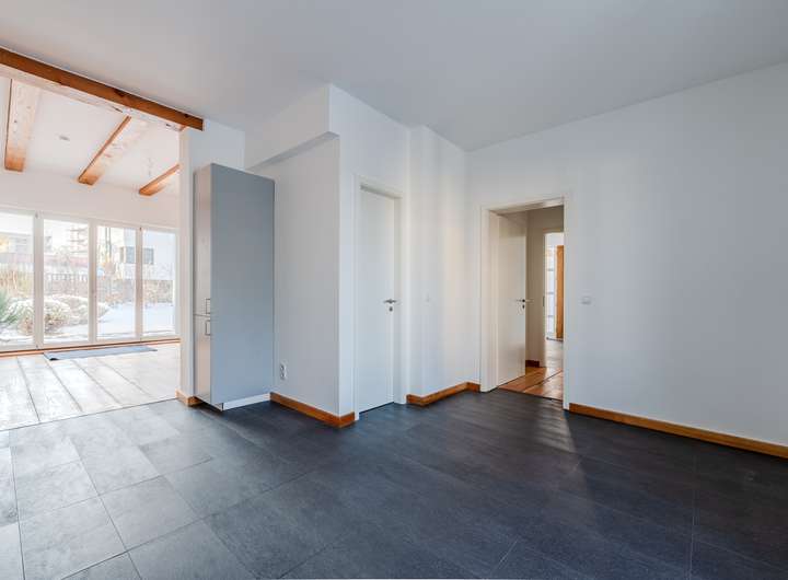 Die im Jahr 2018 in massiver Bauweise errichtete Villa entspricht modernsten energetischen Standards und überzeugt durch ihre zeitlose Eleganz, Großzügigkeit und hochwertige Ausstattung. Auf rund 190 m² Wohnfläche verteilen sich fünf durchdacht konzipierte Zimmer über drei Ebenen. Der untere Wohnbereich beeindruckt mit bodentiefen Holzfenstern, edlem Echtholzparkett sowie einer lichten Deckenhöhe von ca. drei Metern, die ein offenes, helles und repräsentatives Raumgefühl schaffen. Der mit Holz beplankte Übergang zur Terrasse und zum Garten wirkt nahezu nahtlos und erweitert den Wohnraum optisch. Die offen gestaltete Wohnküche fügt sich harmonisch in das Raumkonzept ein, bietet ausreichend Platz für die gesamte Familie und rundet das wohnliche Ambiente perfekt ab. Ein Gäste-WC befindet sich im großzügig gestalteten, gefliesten Eingangsbereich.