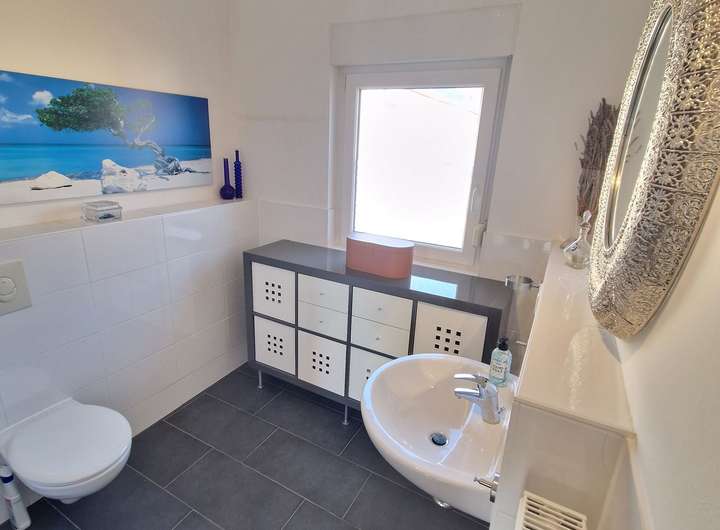 Im Obergeschoss befindet sich ein komfortables Bad mit Badewanne und Dusche, während das Dachgeschoss über ein reines Duschbad verfügt.