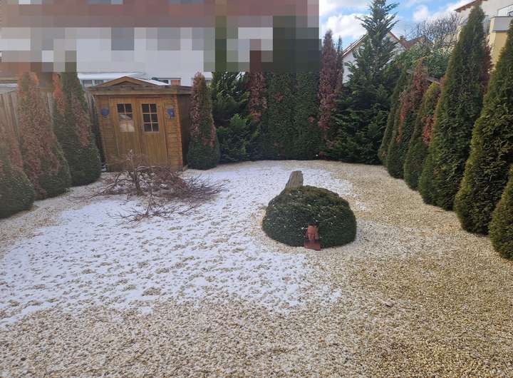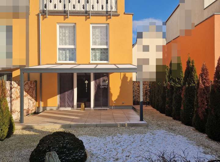 Der pflegeleichte Garten verfügt über eine überdachte Terrasse sowie ein praktisches Gartenhaus und bietet damit sowohl Erholung als auch Stauraum.