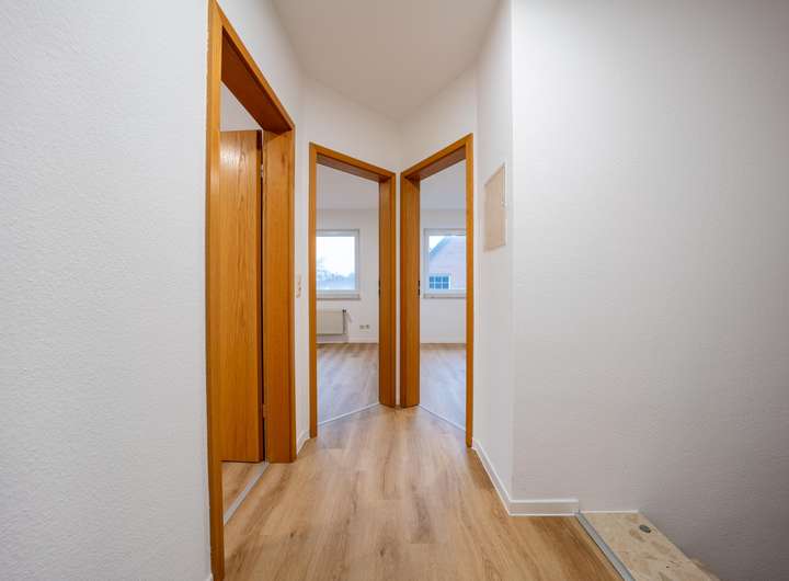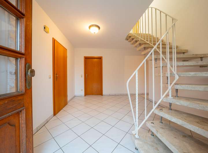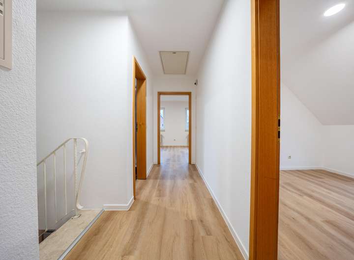 Vor der Neuvermietung wurde das Haus nochmals umfassend überarbeitet. Der Echtholzparkettboden im Erdgeschoss wurde fachgerecht aufgearbeitet und präsentiert sich in gepflegtem Zustand. Im Obergeschoss wurde neuer Design-Vinylboden in passender Holzoptik verlegt, der sowohl optisch ansprechend als auch pflegeleicht ist. Damit verbindet das Haus eine wohnliche Atmosphäre mit zeitgemäßer Alltagstauglichkeit.