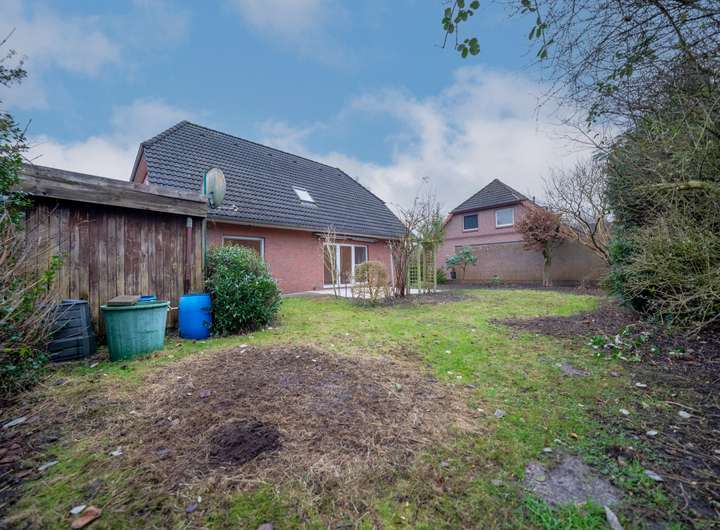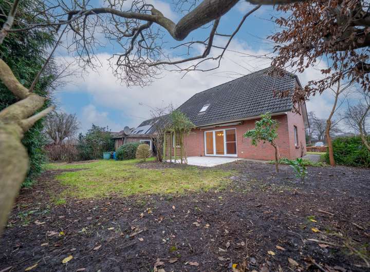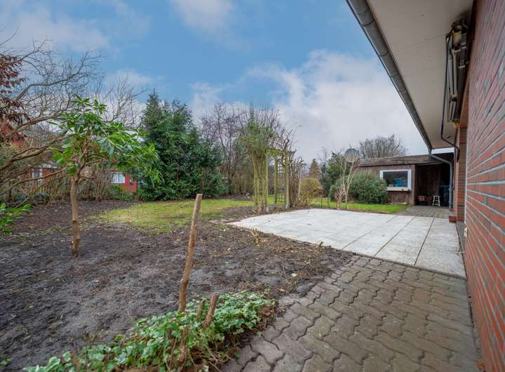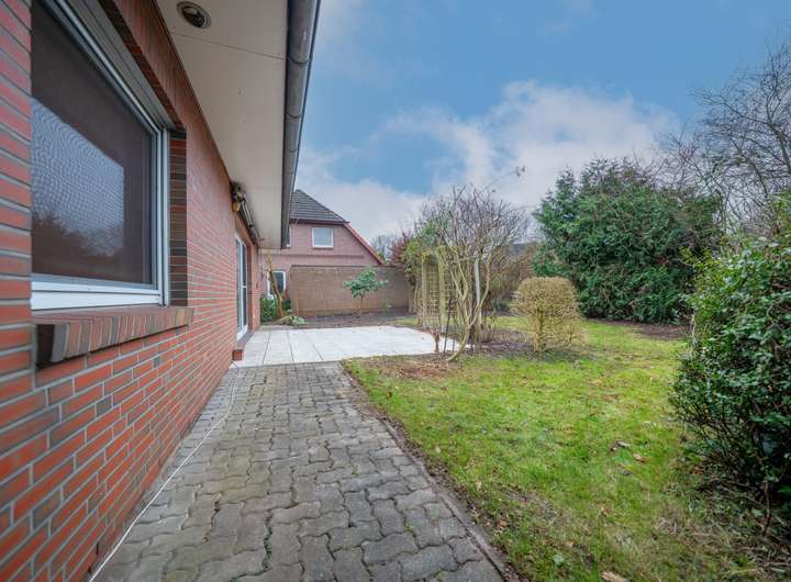Der Außenbereich ist pflegeleicht angelegt. Eine Terrasse sowie gepflasterte Wege rund um das Haus laden zum Verweilen ein und schaffen eine angenehme Verbindung zwischen Innen- und Außenbereich. Das Grundstück bietet ausreichend Platz für Gartenmöbel, Spielmöglichkeiten oder entspannte Stunden im Freien.