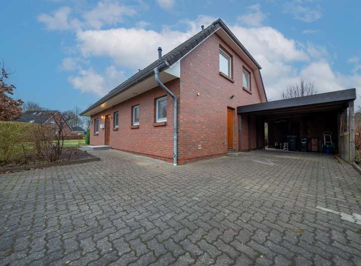 Der klassische Massivbau mit rotem Verblendmauerwerk und Krüppelwalmdach vermittelt bereits von außen einen soliden und zeitlosen Eindruck. Eine breite Auffahrt mit zwei Stellplätzen nebeneinander sowie ein zusätzlicher Stellplatz im Carport sorgen für komfortables Parken. Direkt angrenzend befindet sich ein großzügiger Geräte- und Lagerschuppen, der ideal für Fahrräder, Gartengeräte oder Hobbyequipment geeignet ist.