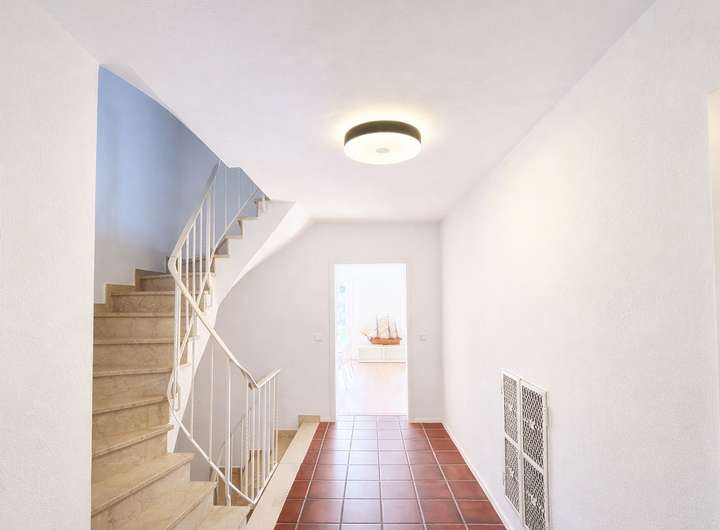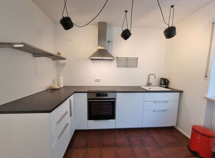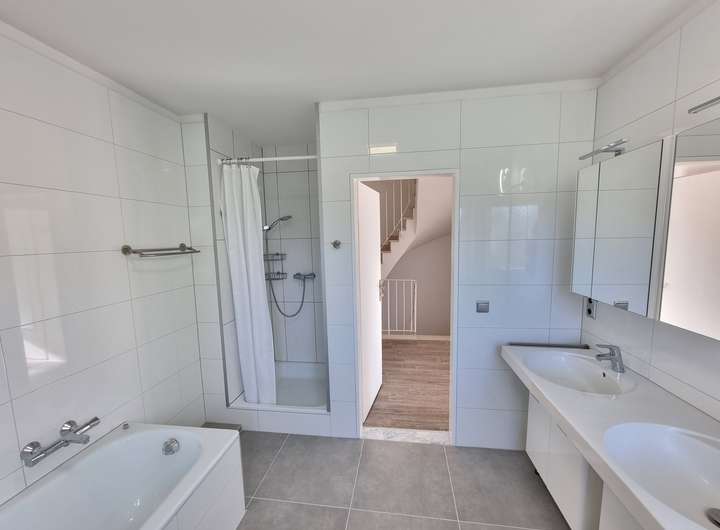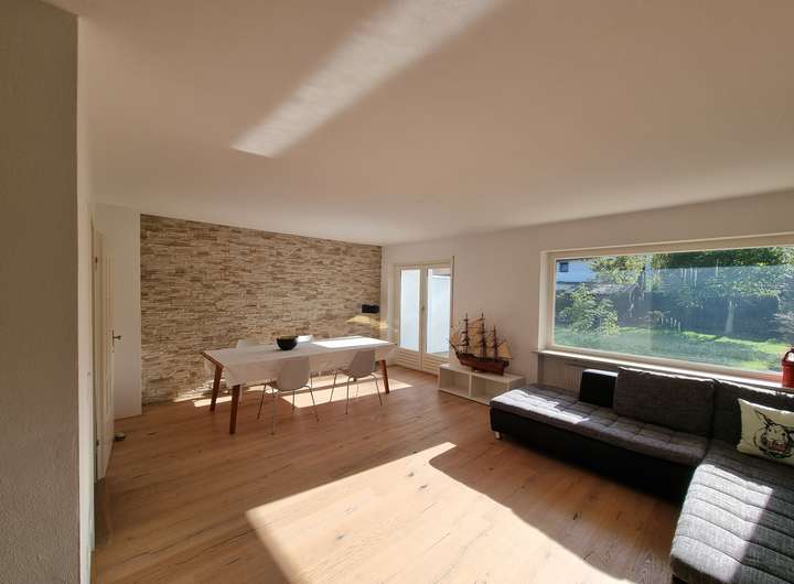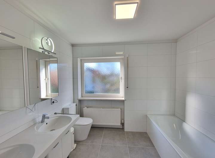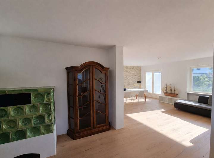 Ausstattung: Teilmöbliert mit hochwertigen Möbelstücken. Edler Echtholz-Parkettboden im großen offenen Wohn-/Esszimmer. Voll funktionstüchtiger Kachelofen. Eine Wand Naturstein. Ausgebauter 2. Stock mit Dachspitz mit großen Dachflächenfenstern – ideal z.B. als helles Arbeitszimmer. Klassischer, praktischer Schnitt des ganzen Hauses. Neue, helle Einbauküche ist vorhanden. Das geräumige Bad mit Dusche und Badewanne ist frisch renoviert. Trockener Keller mit großem „Hobbyraum“, viel Stauraum und Waschküche.